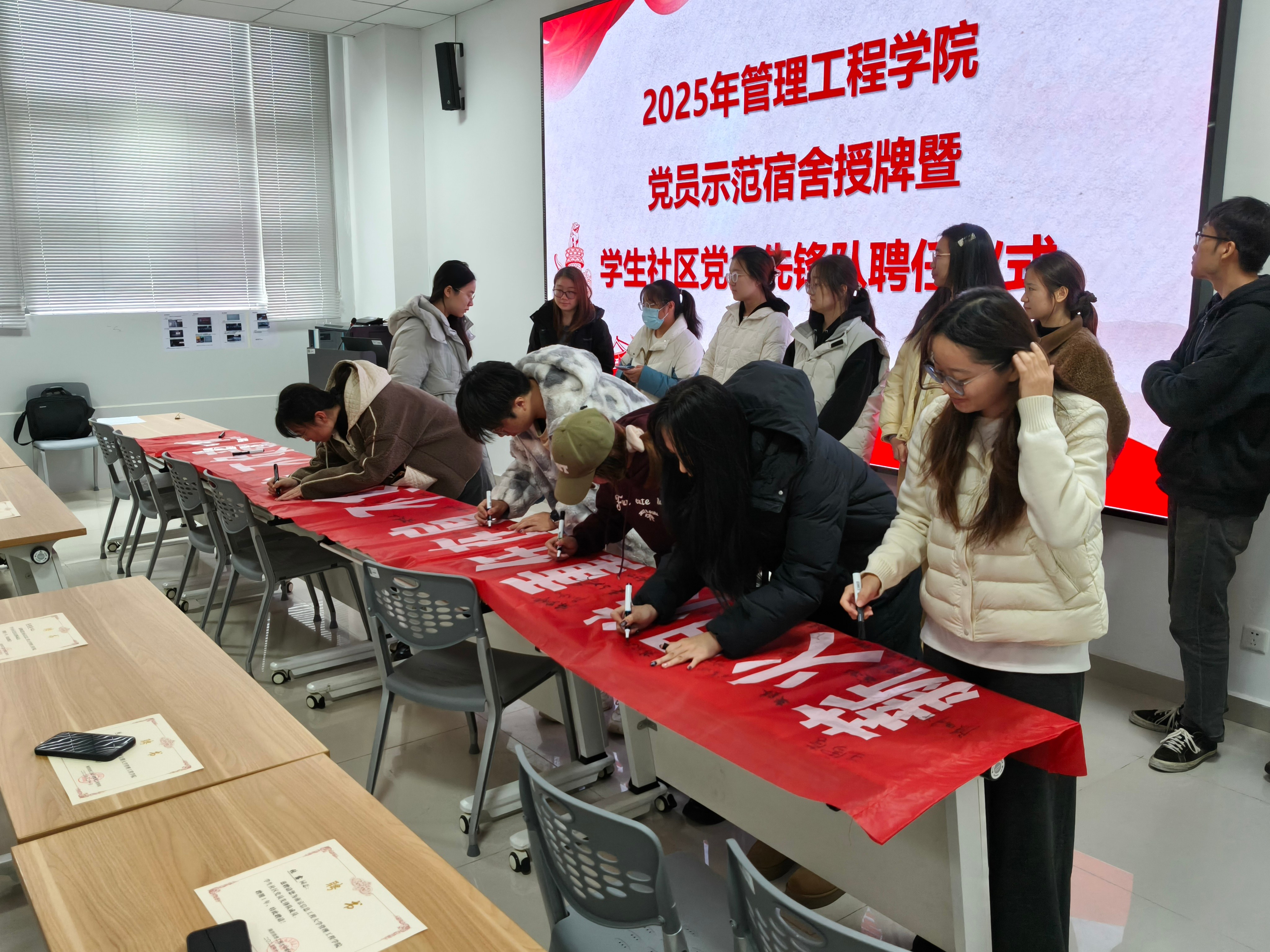 为深化“一站式”学生社区党建网格化建设,切实发挥党建在学生社区中的思想引领与价值塑造作用,推动党建工作与社区育人深度融合,12月2日下午,管理工程学院举行了2025年党员示范宿舍授牌暨学生社区党员先锋队聘任仪式,学院党员示范宿舍学生及学生社区党员先锋队成员代表参加,活动由辅导员王猛进主持。