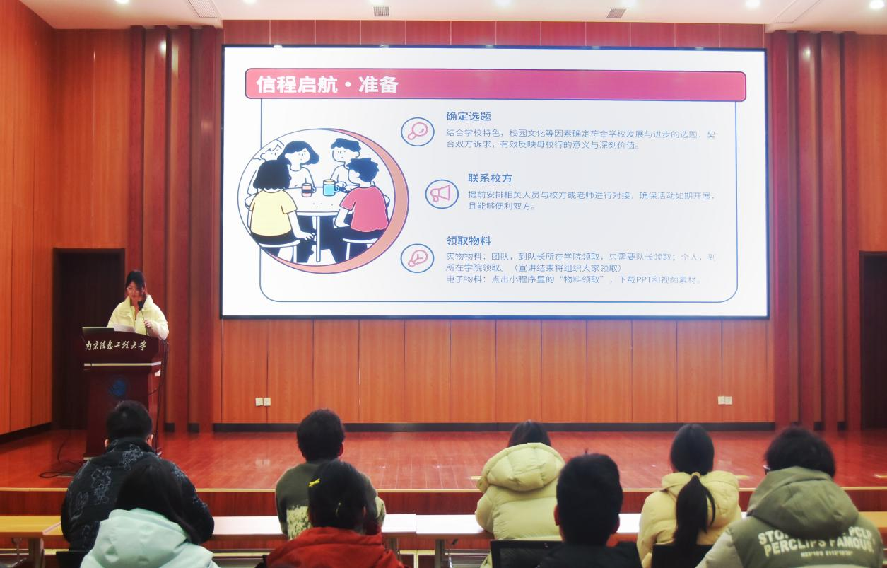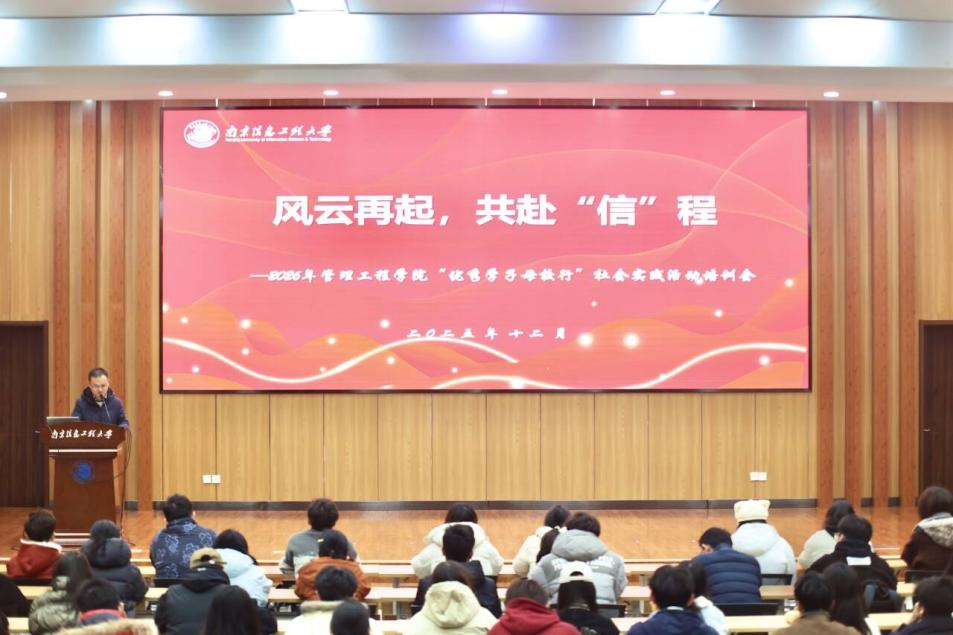 为充分发挥实践育人功能,进一步强化爱校荣校意识,传承南信大精神,传播南信大声音,管理工程学院于12月21日晚在滨江报告厅举办2026年“优秀学子寒假母校行”社会实践培训会。辅导员冀瑞鹏出席本次活动,各团队队长参与本次培训。