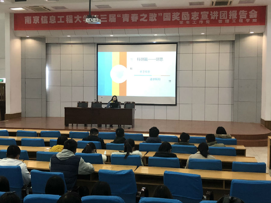 2017年12月28日下午,管理工程学院在滨江学院报告厅举办“青春之歌”国奖励志宣讲团报告会。此次报告会由院分团委书记郭宏赛老师主持,17级辅导员李鸣老师参加。国家奖学金获得者朱亚萍、杨嘉韵、李迎迎、马秀娟,国家励志奖学金获得者代表王雪娇等5位同学为学院全体17级新生做励志宣讲。